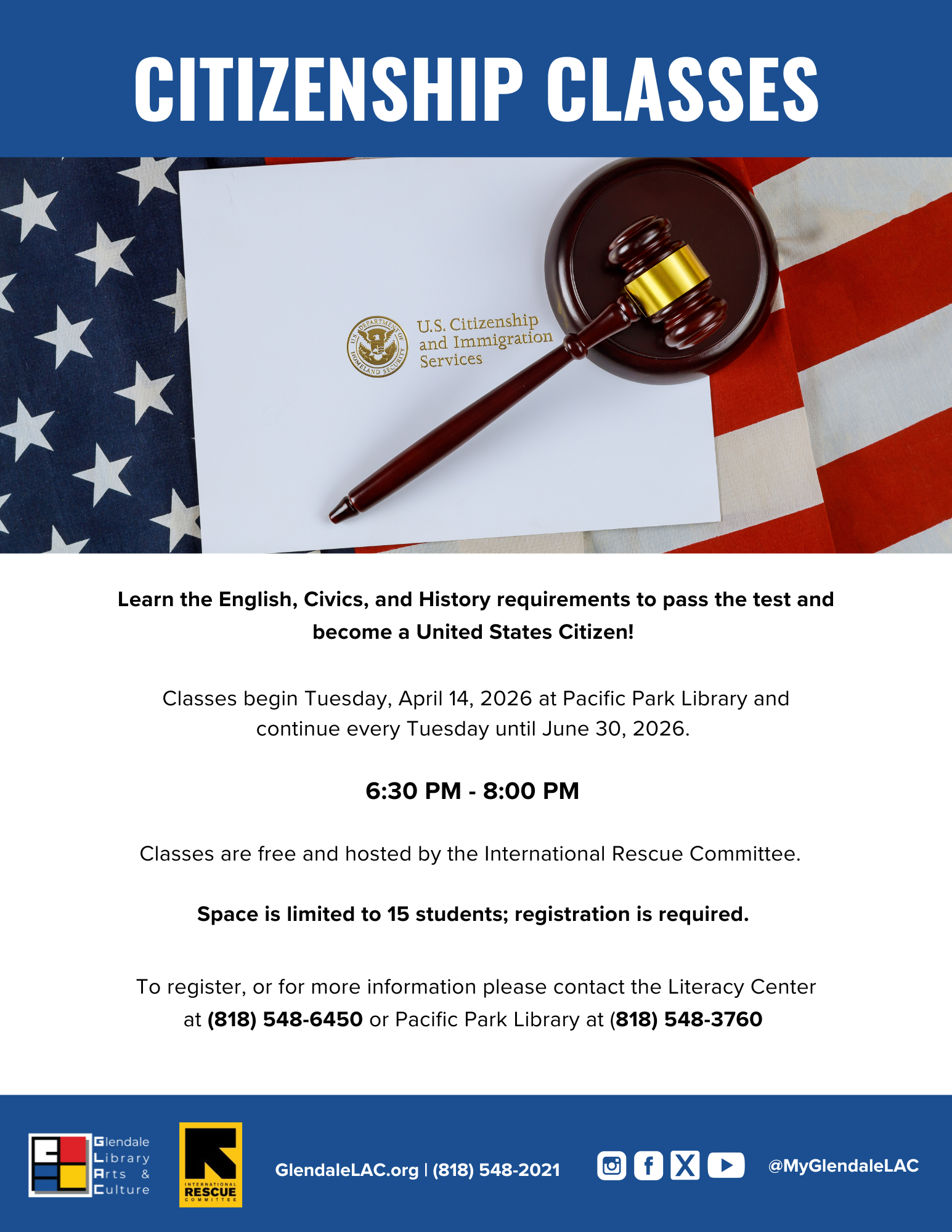 Citizenship Classes (Open to the public)- Students learn the English, Civics, and History requirements to pass the test and become a United States Citizen. Classes begin Tuesday, April 14 2026 at Pacific Park Library and continue every Tuesday from 6:30 PM - 8:00 PM until June 30, 2026. Classes are free and hosted by the International Rescue Committee. Space is limited to 15 students; registration is required. Please contact the Literacy Center at (818) 548-6450 for current class schedule.